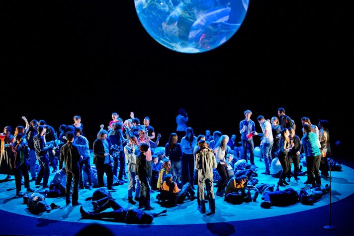 На самом деле спектакль – не сухой диспут, по углам сцены расположилась группа The Sheepray, играющая электронную танцевальную музыку, она задает ритм, под который события на сцене то происходят в бешеном ритме, то тормозят. Кто-то из героев выходит вперед с микрофоном, спрашивая: кто у нас самый быстрый? Кто больше всех отожмется? Кто танцует под электронную музыку? Кто может изобразить драматическую смерть? На некоторое время действо становится похоже на корпоратив с конкурсами и разудалыми ведущими. Кто может провести минуту бездействия на сцене? – герои молча смотрят на нас, а мы на них.
