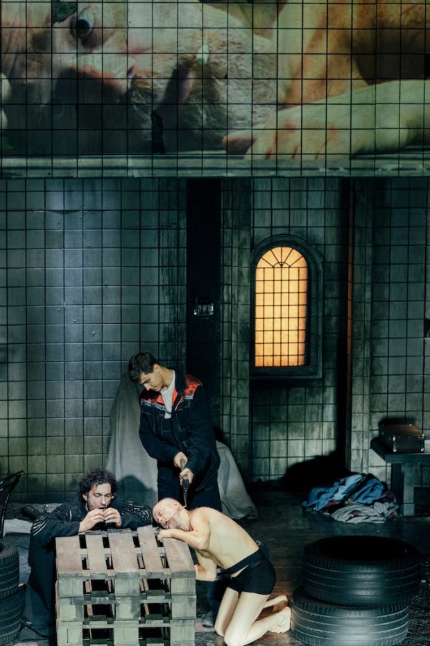 Режиссер сохраняет сюжет, однако вместе с художником Фемистоклом Атмадзасом помещает действие в некий современный цех по переработке автомобильных покрышек: они разбросаны повсюду, а когда отправляются в молотилку, то выходят оттуда грудами серебристого пепла. Так и гуманистические, и художественные идеи прошлого в наш век звучат и смотрятся чем-то, переплавленным из отходов былого величия; чем-то утилизированным до уровня ширпотреба.