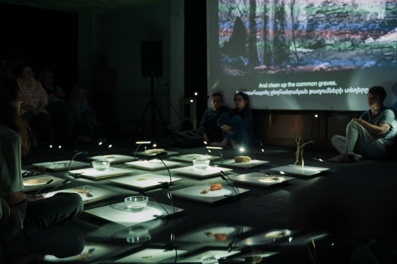 Артем Томилов в зуме объединил участников своей лаборатории в Бишкеке и фестивальный зал в Ереване в перформанс «Далеко-близко». Люди по обе стороны экрана говорили о себе, бродили, пили пиво, танцевали, читали тексты и пели песни, показывали друг другу какие-то важные вещицы, или не важные. Искусство и перформанс начинали присутствовать в бытовых вещах, в тех процессах жизни, которые не ассоциируются с искусством. Любое событие, погруженное внутрь театрального фрейма, подсвечивалось чем-то большим. Обнаруживало в простейших действиях рифмы, схожесть, близость. Любой отклик, любое предложение оказывалось уместным и свободным.