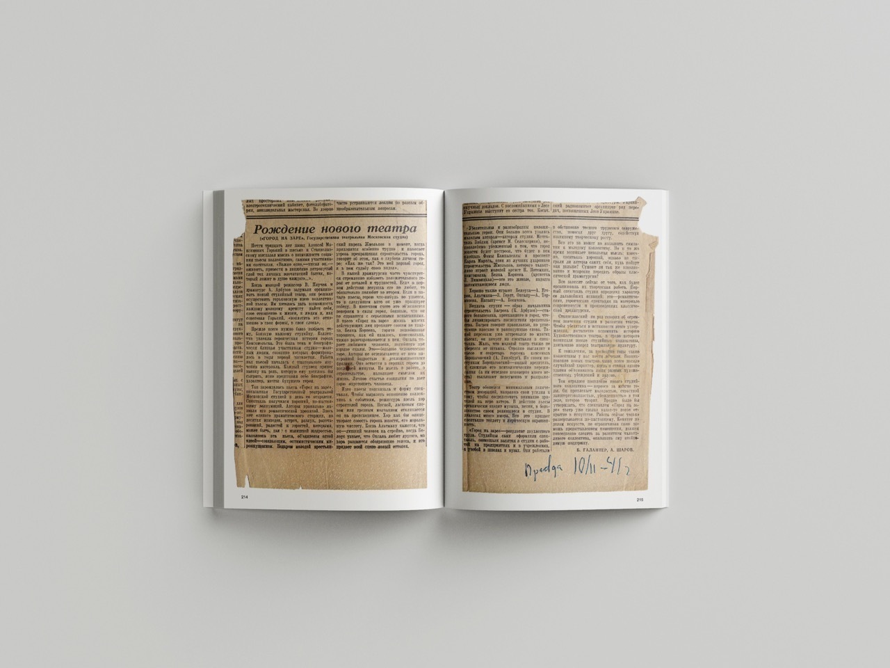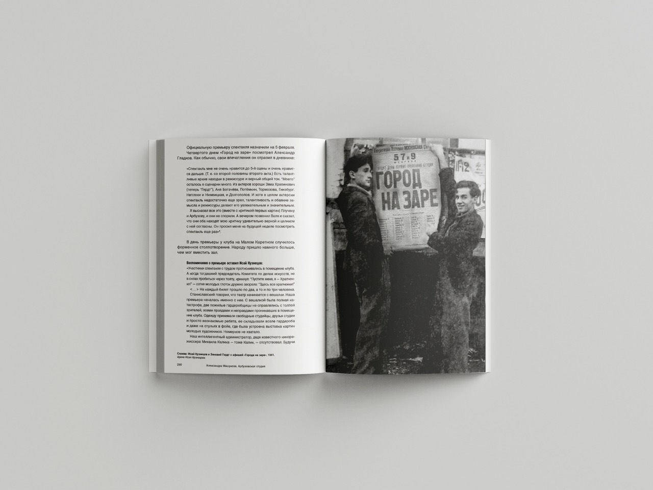 Впрочем, эстетическое новаторство в опыте Арбузовской студии тоже было — хотя бы в необычайном эксперименте по коллективному созданию пьесы (знаменитого «Города на заре») и вообще изначально «горизонтального театра», как это назвали бы сейчас. Это одна из причин, по которым книга Александры Машуковой состоит, главным образом, из частных голосов очень разных людей, участников и очевидцев. Воспоминания, дневники, архивные записи, свидетельства критиков, письма студийцев и записки зрителей — множество документов составляет основную часть текста, последовательно рассказывающего о судьбе студии и её участников (а также об опытах постановки «Города на заре» на других площадках в последующие годы). Однако авторский текст не менее интересен, чем документальная составляющая (и доступен даже «неподготовленному» читателю): ученица Натальи Крымовой, Александра Машукова избегает обеих крайностей — излишней эмоциональности и наукообразной сухости, — а равно и «тяжеловесности» самой речи. Любопытно, что, во многом занимаясь исследованием времени и создавая своеобразный культурный портрет эпохи, автор фокусируется на главной теме исследования и уходит от соблазна избыточного погружения в контексты других времён и явлений. Исчерпывающий образ связи эпох даёт сама Арбузовская студия — и её основатели, уникальные в этом смысле фигуры отечественной культуры ХХ века Алексей Арбузов и Валентин Плучек. Дополняют издание многочисленные иллюстрации — портреты, фотографии рукописных материалов и даже карта «важнейших мест Арбузовской студии».