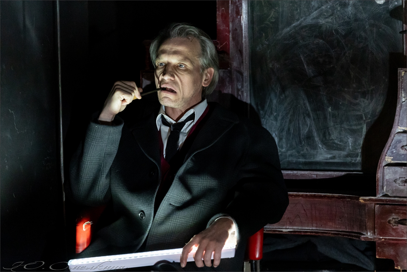 Помимо Александра Новикова, который, как сказано в программке, сыграет не только Нормана, но и Шута, в спектакле будут участвовать лишь двое артистов. Сэра Джона (и короля Лира) сыграет Олег Фёдоров. Других мужских персонажей в постановке Кочержевского нет, а все женские роли (их, считая Корделию, четыре) исполнит Ольга Муравицкая.