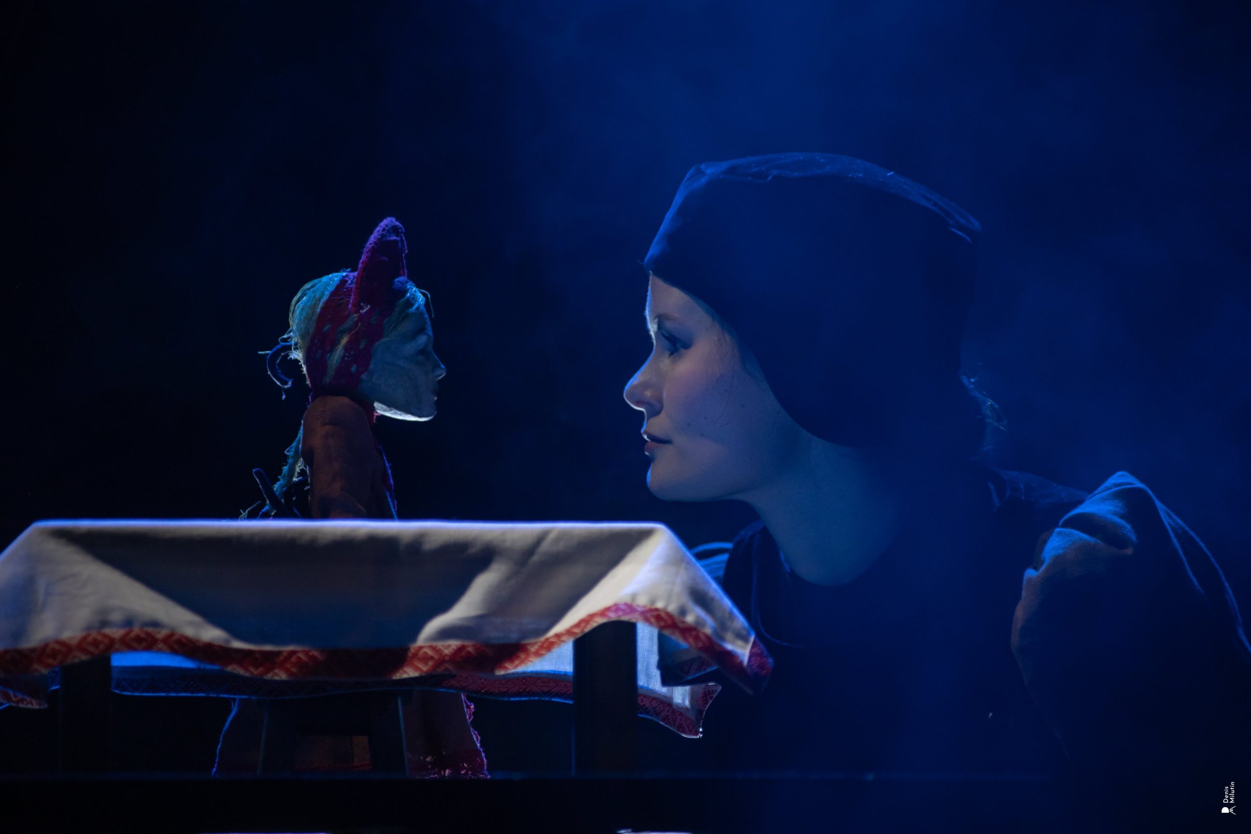 Русские народные сказки составляют огромную часть репертуара Театра кукол Республики Карелия, однако во многих случаях здесь выбирают нетривиальные подходы к знакомым историям. Впрочем, так же — через призму современного восприятия и даже добрую иронию — в этом театре представляли и карело-финский эпос: знаменитый спектакль Олега Жюгжды «KALEVALA. RUны» (2019) носит жанровое определение «взгляд чужеземца». Екатерина Ложкина-Белевич в своей премьере, также предлагая возвращение к народной культуре, фольклору как полузабытым истокам, свой «взгляд чужеземца» понимает как временную дистанцию, разрыв, который отчасти возможно преодолеть. Выходя за рамки сказки для детей, она помещает знакомую историю в контекст обрядовой песенной традиции и той реальности — уклада и мировосприятия, — которая их породила. Но при этом создатели спектакля сохраняют связь и с сегодняшним днём, чему способствует оригинальная музыка, написанная Евгением Серзиным. Такое отношение к материалу во многом близко мастеру Ложкиной-Белевич Руслану Кудашову, а отчасти продолжает поиски, начатые в одной из её самых заметных работ — также основанной на русской народной сказке постановке «Журавль и цапля» в петербургском Большом театре кукол.