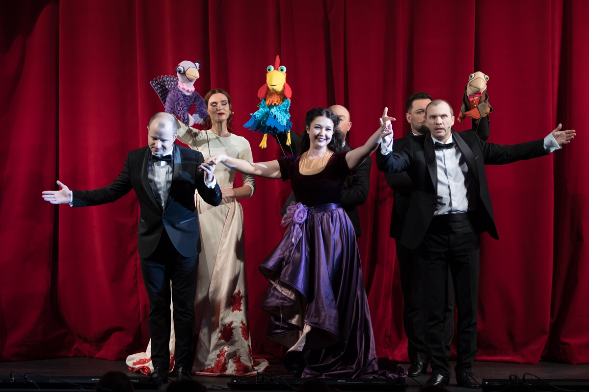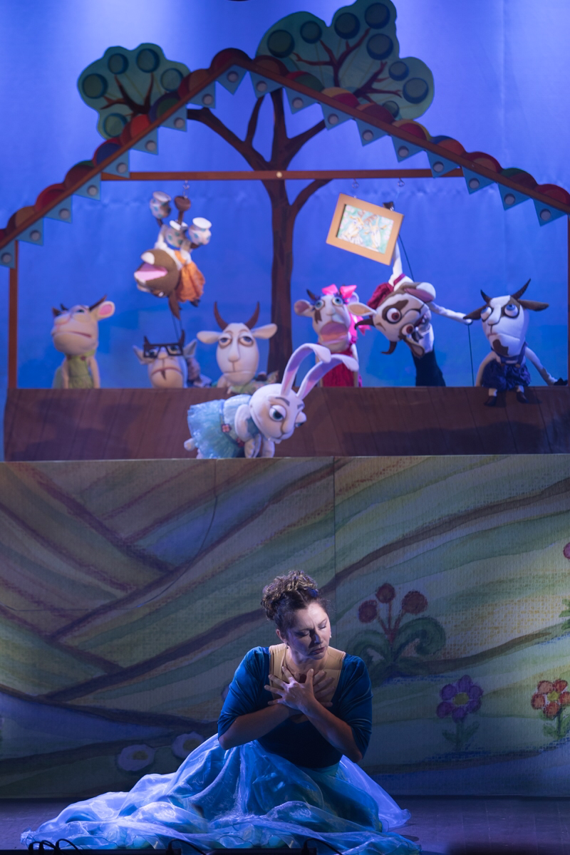 При этом кукольная часть действия соединяется с живым планом: все артисты участвуют и в действии за ширмой (за которой их иногда становится видно), и в живом плане на авансцене, где они периодически оказываются и с куклами в руках, и без них. Вокальные партии, которые актёры исполняют вживую во время спектакля, участники премьеры начали учить ещё весной, до начала репетиций. Сами куклы в спектакле тоже «поющие» — это послушно открывающие рты маппеты.