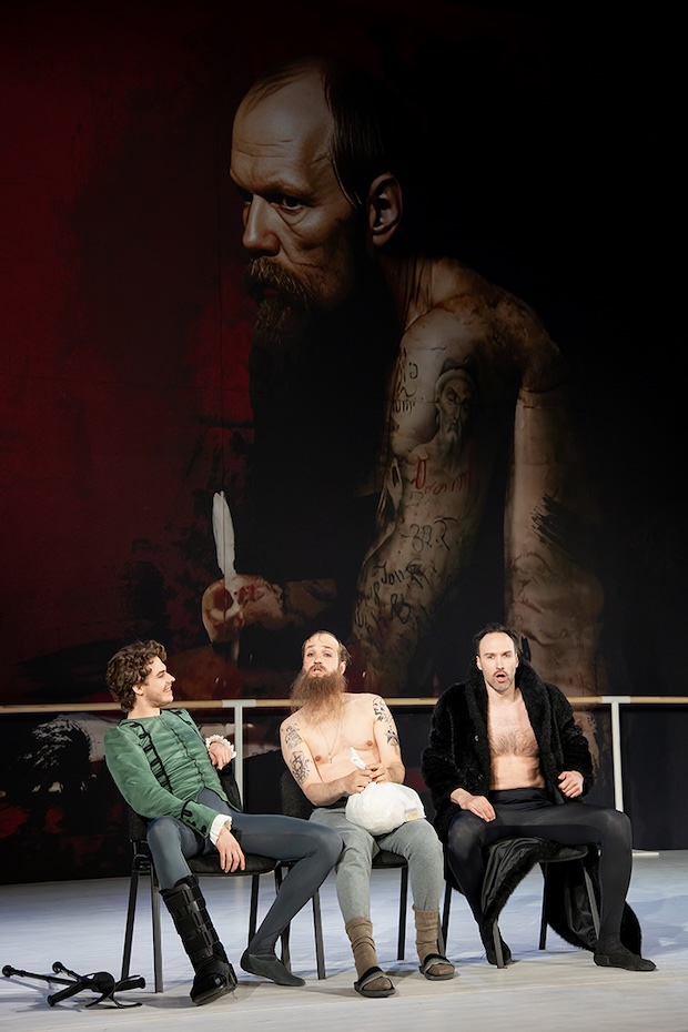 Спектакль идёт на фоне огромного плаката, изображающего Достоевского, как его представил себе ИИ, «накормленный» Сорокиным. А перед самой первой сценой (той, в которой танцевали девицы Епанчины) будущий Мышкин появлялся как человек от театра, рассказывающий о самом Достоевском: в том числе, озвучивающий и признание самого писателя, что он не отдал бы и все «радости, которые может дать жизнь», за то счастье, которое испытывают эпилептики за секунду перед припадком. И мнения современников: что он мог иногда падучую и имитировать.