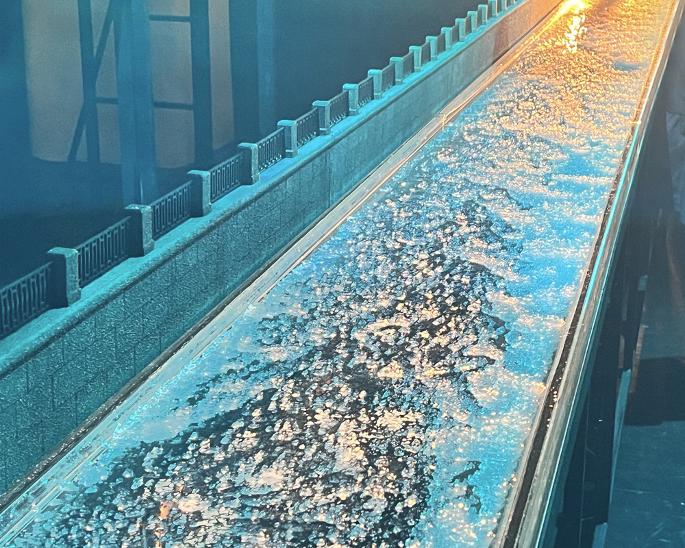 Иван Поповски, работая над постановкой (как и над многими своими спектаклями в Театре Камбуровой) и как художник, предлагает зрителям Большого зала оказаться максимально близко к происходящему — и в максимально «петербургской» мизансцене: как бы вытягивая пространство, выстраивая три длинных ряда вдоль условной набережной. Зритель оказывается «лицом к лицу» с постановкой, жанр которой обозначен так: «Навеяно Шостаковичем и Временем».