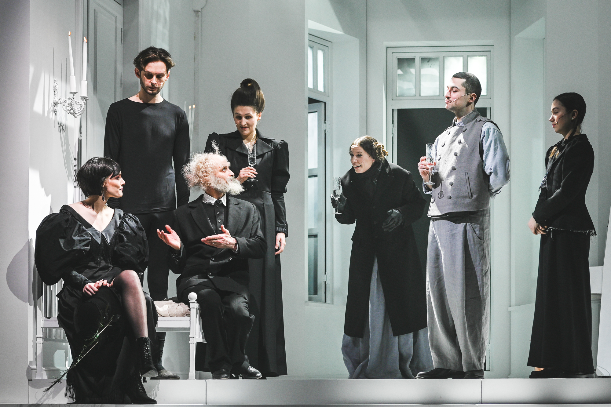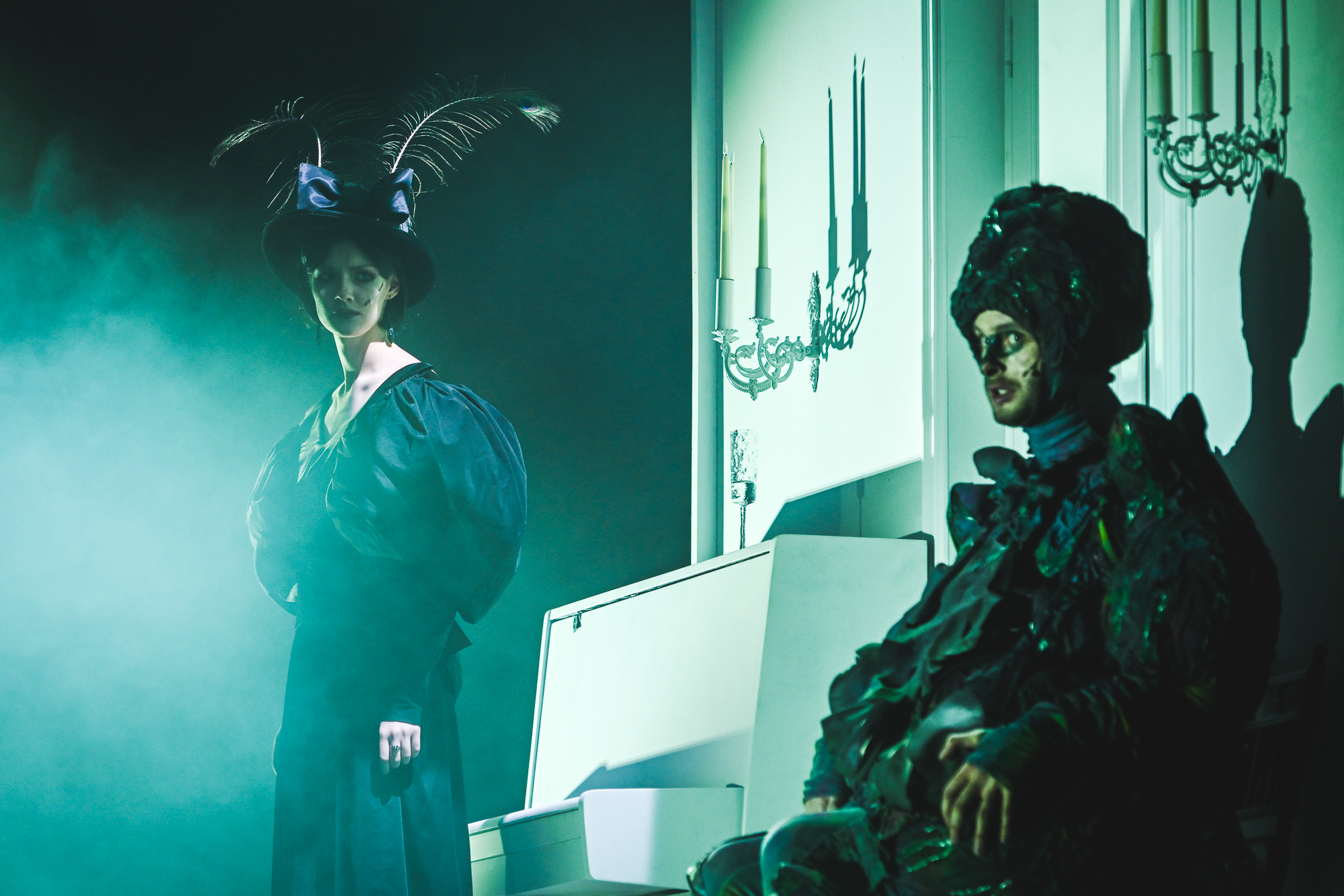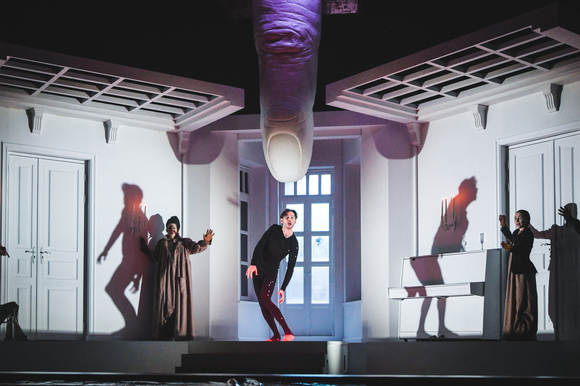 Но, разумеется, на двадцатом веке скрытое движение не останавливается, хотя и оно много даёт: сколько ассоциаций рождает вышедший с балкона и, к большому сожалению отца, не убившийся Хороший человек — его инфернальный кредитор? Самое меньшее — в диапазоне от хармсовых старух до знаковой для «Таганки» пьесы Брехта: уже автоматически переводя в мыслях странное наименование персонажа, получаешь guter Mensch — была такая раздвоенная личность из Сезуана… Однако среди всех этих игр, включая открытую «игру в театр», создатели спектакля ищут личные и универсальные болевые точки — поэтому вовсе не заблуждаются зрители, смотрящие «Превращение» как странную, но «прямую» историю. В этом монохромном мире много физически, кожно знакомого — уюта и неуюта, хрупкой гармонии и звенящей тревоги, взвинченности и нервозности. И многослойности совсем не «культурной», а жизненной: сестра Грегора возмущённо восклицает, что поведение отца и происходящее с ними — «Demütigung» (унижение), тот шипит в ответ: «Что ты вообще знаешь про Demütigung?» — в этом сразу и попытка поставить на место зарвавшуюся девчонку, и боль конкретного, действительно известного опыта.