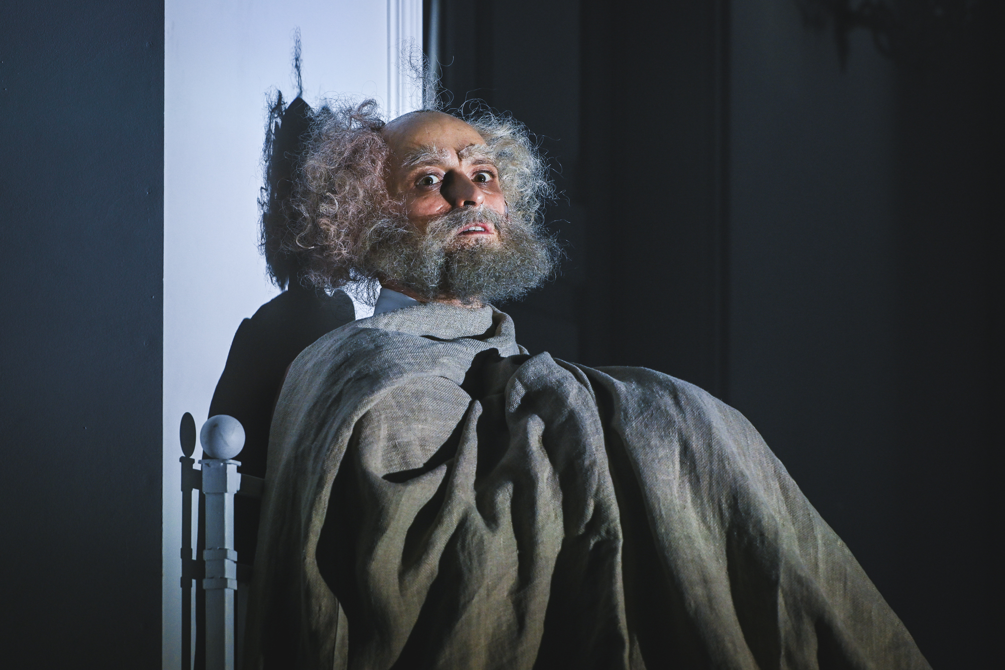 Но переодевается Грегор тут не раз — и не он один. Больше всего метаморфоз, разумеется, у отца — многоликой фигуры: неизменны лишь всклокоченная седая шевелюра и такая же борода. Он то сказочный гном (добрый или злой), то мифологический Кронос, то ветхозаветный пророк. В какой-то момент — внезапно «полуобнажённый» в уродливых толщинках (напоминающих о другой, новосибирской роли Григорьева — Петерсе из одноимённого спектакля). В другой — в зелёном охотничьем костюме начала века, в третий — в респектабельной чёрной тройке из тех же времён. А ещё — в видавшем виды «хозяйском» халате-плаще. Но отцовские превращения зависят не столько от перемены облика, сколько от смены интонаций. Можно сказать — от смены ракурса, как в центральном эпизоде спектакля. Со стариковски плаксивой нежностью отец вкрадчиво просит у Грегора разрешения лечь спать в его кровати: эта кровать по величине — детская, в неё не поместится даже человек среднего или небольшого роста, а уж её высокому «хозяину», вероятно, в ней пришлось бы сложиться пополам. Грегор укутывает отца, тот спрашивает несколько раз — как бы с тревожной мнительностью: «Ты хорошо меня укрыл?» — и делает резкий переход: «Хотел навсегда меня укрыть, да?». В этом патологическом перепаде — не смешное и даже не страшное, а, увы, жизненно достоверное, знакомое многим если не из личного опыта, то из близкого созерцания… И вслед за этой фразой, резко и мгновенно — одним движением, — беззащитный отец встаёт на кровати, в вертикали его фигура в одеяле преображается в скульптурный образ, а из-под колосников сквозь «потолок» спускается гигантский «гипсовый» палец…