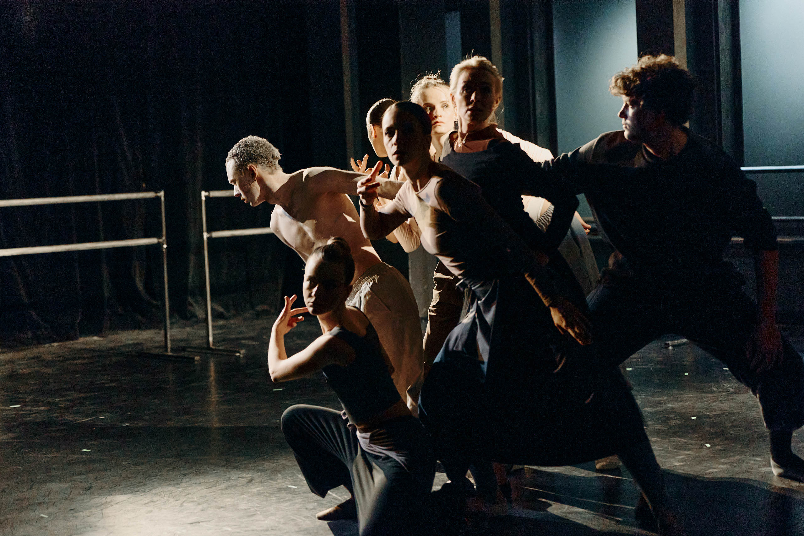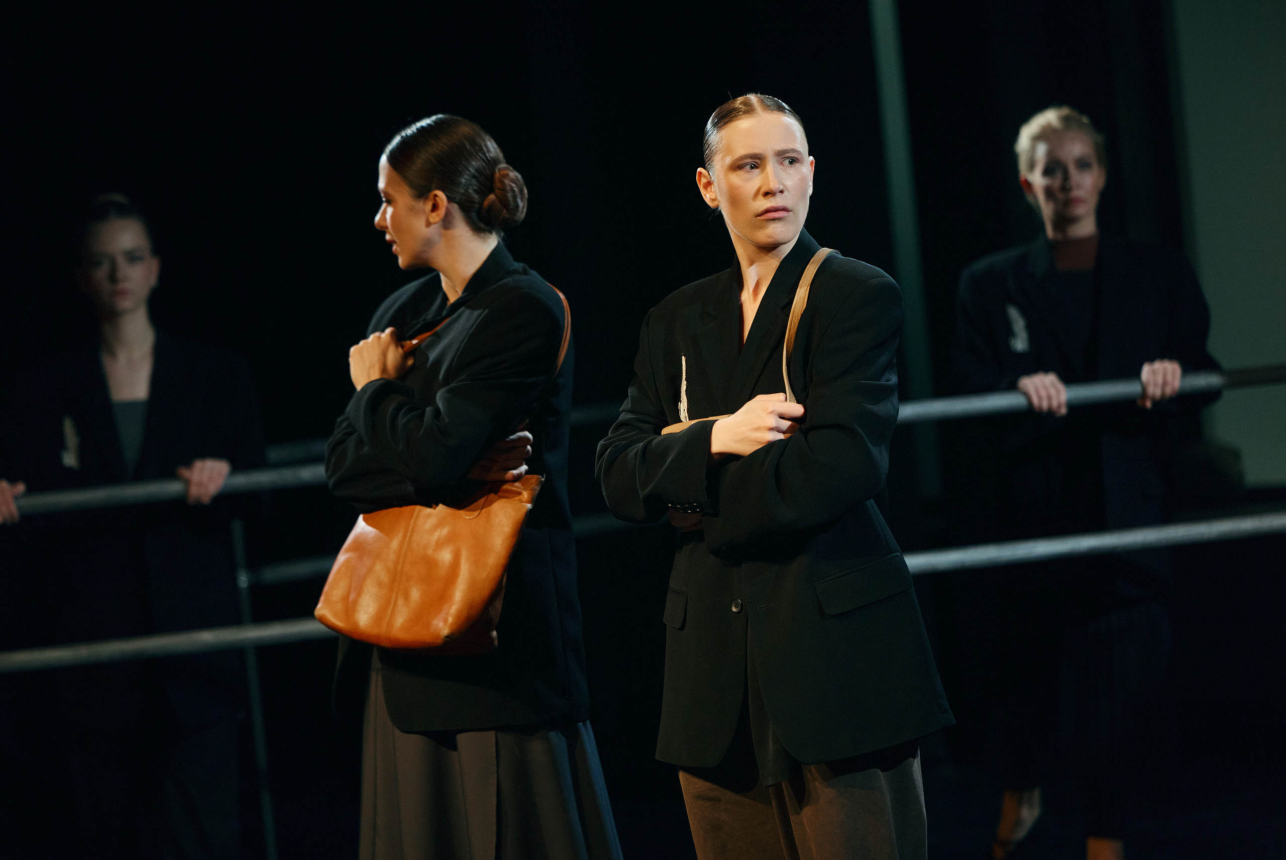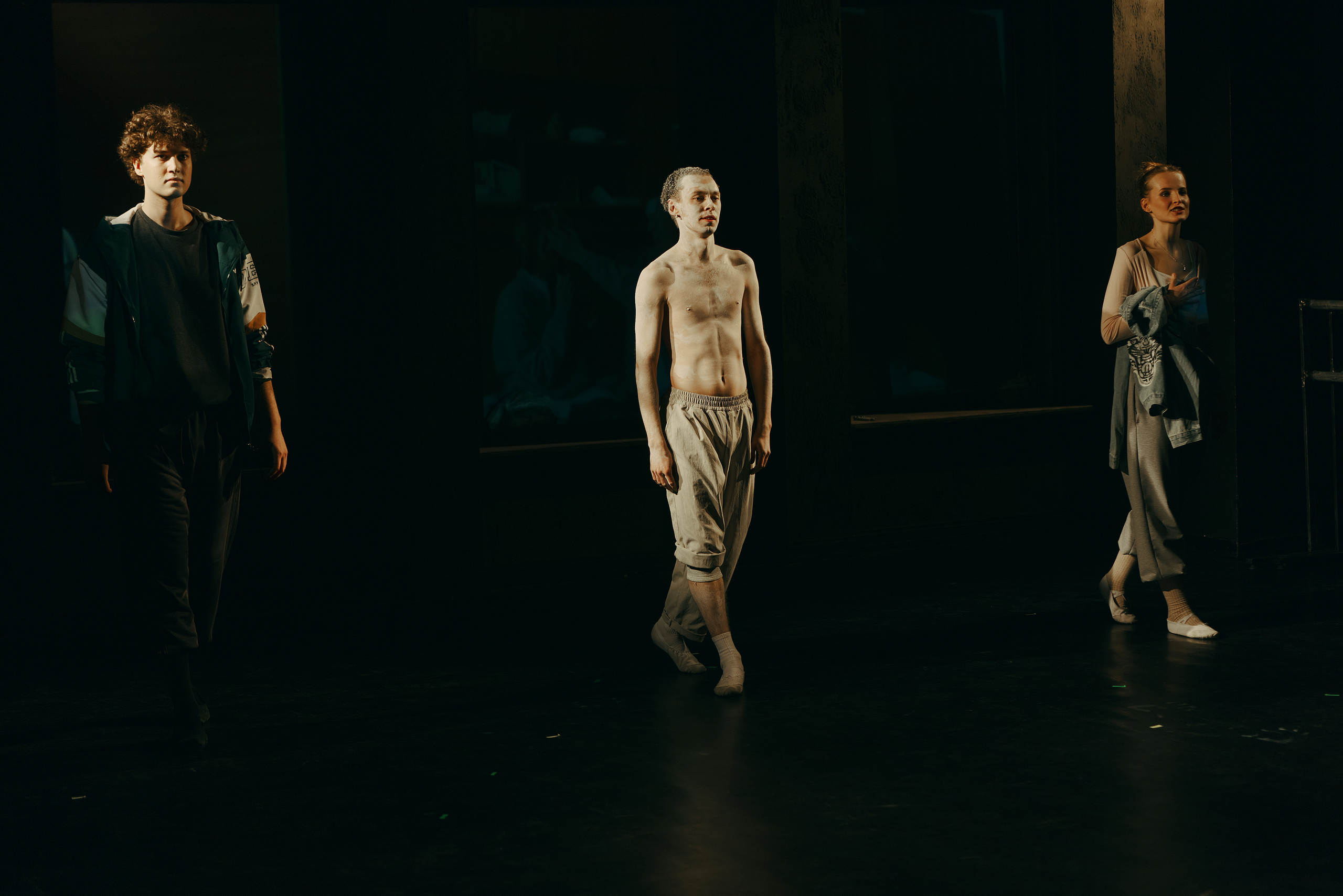 Однако наиболее принципиальное изменение связано с самой структурой повествования. Парамонов убирает трёх из девяти повествователей — тех, кто не знал главного героя лично, сотрудников Академии, которых косвенно затрагивает высказанное в предсмертной записке самоубийцы обвинение и его последствия. Остальные шестеро объединяются в пары — их монологи становятся дуэтами или диалогами, объединяясь по смысловому или событийному принципу. При этом местом действия становится условное пространство балетного класса со станками, напоминающими уличные металлические заграждения и меняющими положение по ходу спектакля.