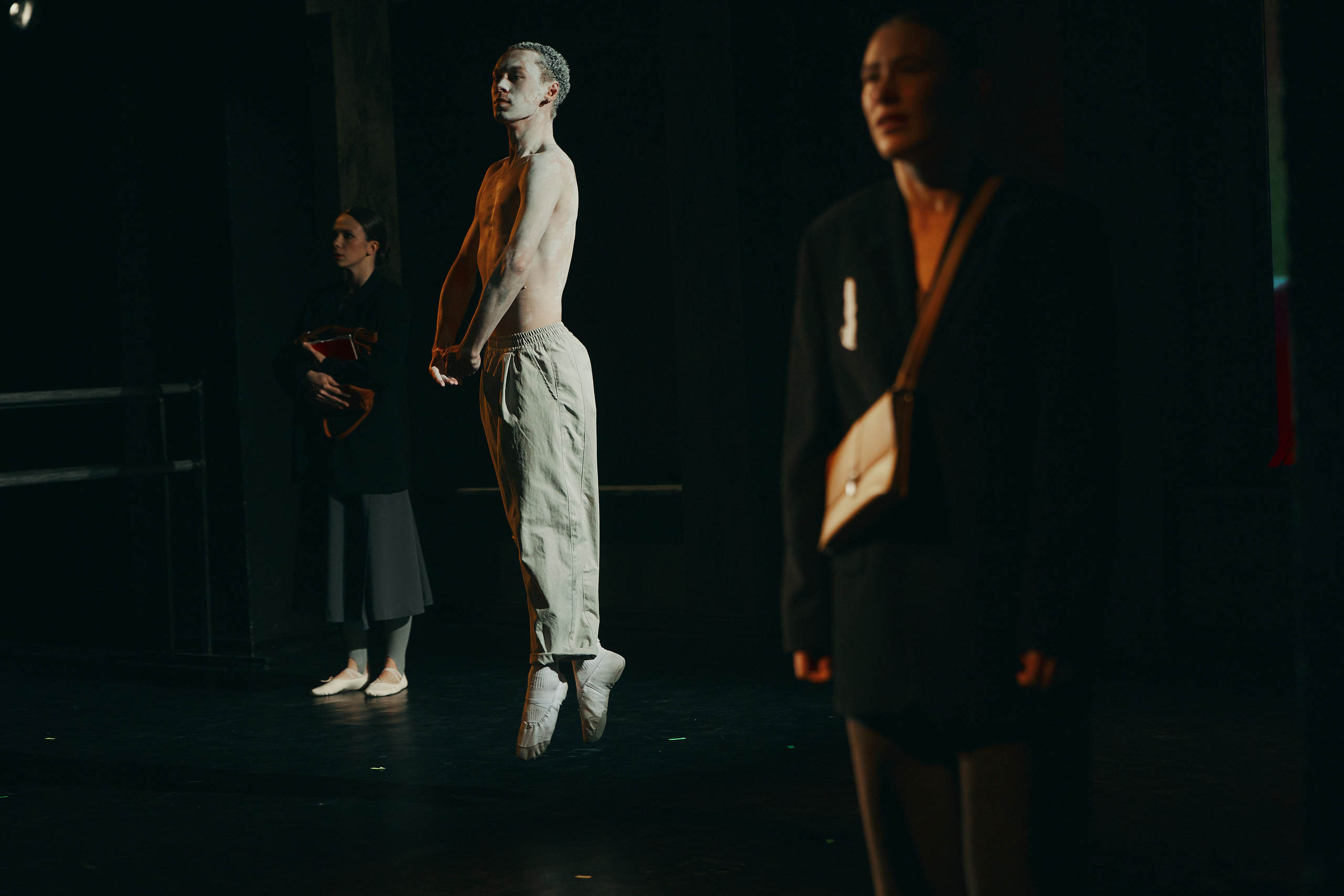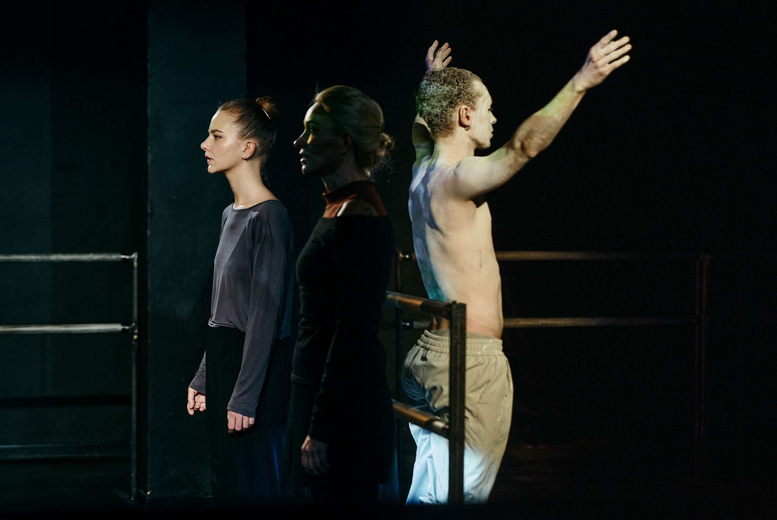 Однако наиболее принципиальное изменение связано с самой структурой повествования. Парамонов убирает трёх из девяти повествователей — тех, кто не знал главного героя лично, сотрудников Академии, которых косвенно затрагивает высказанное в предсмертной записке самоубийцы обвинение и его последствия. Остальные шестеро объединяются в пары — их монологи становятся дуэтами или диалогами, объединяясь по смысловому или событийному принципу. При этом местом действия становится условное пространство балетного класса со станками, напоминающими уличные металлические заграждения и меняющими положение по ходу спектакля.