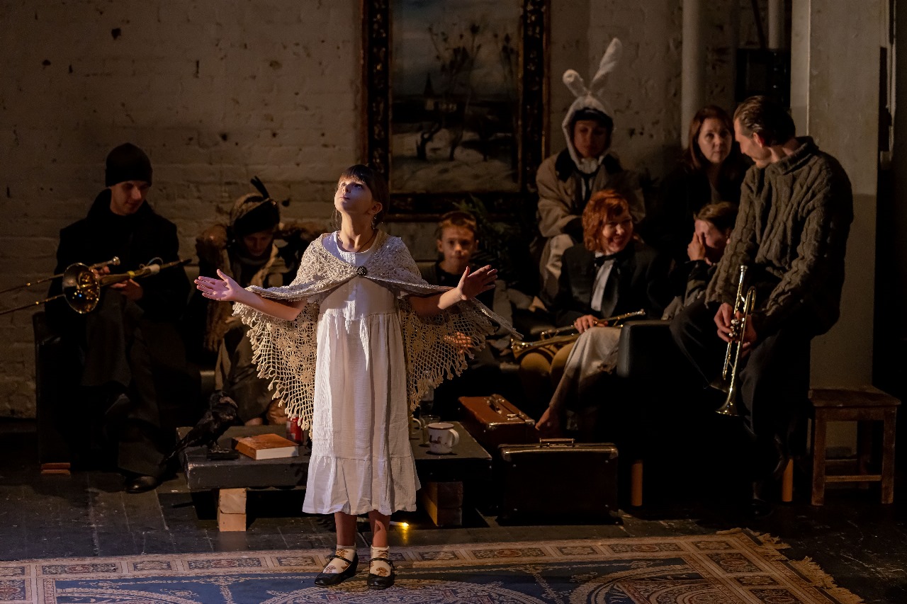 «Доктор Живаго» Толстошевой начинается с камеры — на этот раз не воображаемой, и не фото-, а видео-. Громко хлопнув дверью в кулисах, на сцену выходит некто (Екатерина Кирчак) в мешковатом костюме зайца; с галстуком и в синей кепке с надписью USA — под капюшоном с пушистыми ушами. Этот некто, бормоча на английском, осматривает и снимает пространство: странно-уютную комнату с белыми стенами, репродукцией картины «Грачи прилетели», коврами на полу (художник спектакля — Надежда Бахвалова). В углу под картиной — кожаный диван, как в офисе или лобби, и низкий столик с кучей предметов (стаканы, кружки, банки, даже музыкальные инструменты), над ними в боковом углублении стены микроволновка, с другой стороны — небольшая барабанная установка, у дальней стены — ещё один барабан, огромный. Растение в кадке, фигурка зайца с крашеными яйцами на тарелочке, несколько стульев. Это вся обстановка, которая за время действия меняется почти исключительно с помощью света: в диапазоне от сумрака с точечным мерцанием электрических «свечей» до яркого «комнатного», от жёлтого «печного», с почти пещерными тенями, до зимне-праздничного, с отблесками диско-шара, напоминающими и о звёздах, и о детском восприятии мира. Важная константа этого странного пространства — женщина (Татьяна Лосева) в золочёном костюме с капюшоном и со связкой огромных колосьев в руках, этакая фигура с фонтана «Дружба народов», советская Мадонна. Она остаётся стоять или сидеть на своём «постаменте», составленном из письменного стола и стула на нём, практически весь спектакль. Но эта Колхозница, как названа героиня в программке, отнюдь не молчалива и не бездвижна. Это хрупкое воплощение той самой «большой истории» — одомашненной, впущенной в дом, постоянно присутствующей, хотя по сути и не вмешивающейся в происходящее. Можно принять её за образ «новой культуры» или даже «новой народности»: её пение — народных песен-частушек под балалайку или православных молитв a capella — своеобразный перевод частного в универсальное. Она отличается от остальных героев, но не чужая им (да и вполне современный, сегодняшний юмор тут один на всех). Это очень индивидуальный образ над-индивидуального, вне-индивидуального (в одной из сцен её устами буквально будет говорить Бог), по сути, это, конечно, Хор из античной трагедии. Рядом с ней и скульптурно-белая парковая урна, кочующая в «ОКОЛО» из спектакля в спектакль и неизменно связанная со смертью. И с памятью.
