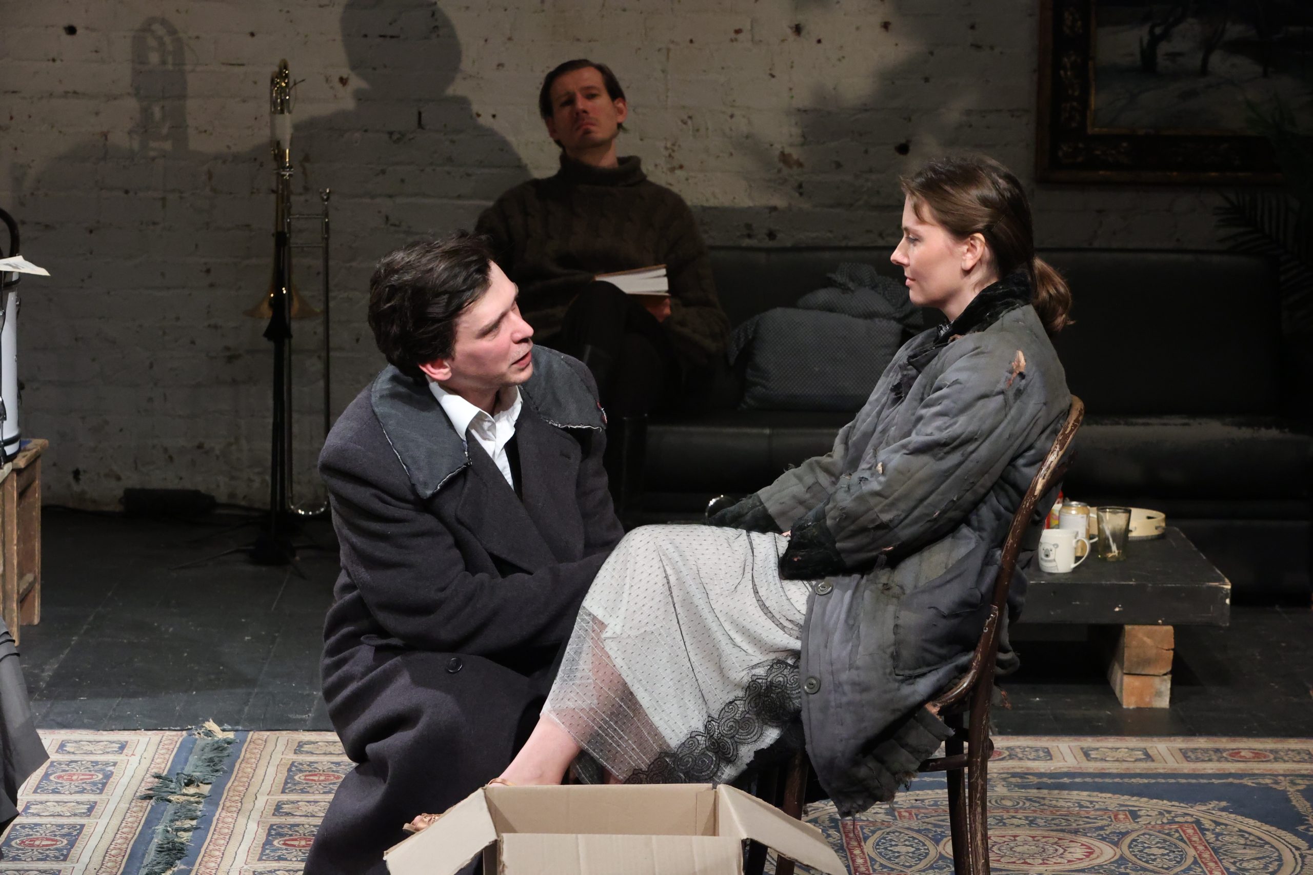 Через монтаж сцен, эпизодов и даже музыкальных номеров спектакль проходит, по сути, весь сюжет романа, сконцентрировавшись на четырёх главных героях: Живаго, Ларе, Стрельникове и Тоне. В этом условном пространстве они почти всегда говорят при свидетелях, произносят свои признания в присутствии других, которых тут не должно бы быть, часто встречаются вчетвером и ведут диалоги «крест-накрест»: споры предсказуемо превращаются в конфликты, молчаливые или громогласные, легко взвинчиваются до истерик и провоцируют саркастические комментарии. Весь этот «театр» (и даже «театральщина») — тот «сор», из которого растут стихи, но и тот «сор», из которого состоит роман, если отнестись к нему как к реалистической прозе. Однако «стихи» растут, и самое главное, сложное и интересное — именно этот робкий процесс, который начинается ещё за разговорами на повышенных тонах или за иронией. И если на премьере осенью 2025-го «Доктор Живаго» был спектаклем сложно устроенным, но «герметичным», то с недавних пор одна из ключевых составляющих этого мира стала ошеломляюще открытой. Изначально подлинная природа странного белого пространства открывалась зрителю только в конце — когда камера вдруг начинала работать, и в трансляции на стене под «финальными титрами» из стихотворений Юрия Живаго появлялись сначала те, кто остался на сцене, а потом — те, кто с неё ушёл. Сидящие за кулисами машут руками, улыбаются, а над их головами вдруг обнаруживается… та же картина Саврасова. То есть, эта условная комната — двойник закулисья. Сейчас это измерение проявлено с лихостью, почти близкой к импровизационным «Клоунам»: здесь не просто ломают четвёртую стену, а позволяют себе как бы реальные репетиционные разговоры, комментируя и обсуждая слова и действия: «ты хорошо сыграл сцену», «видели мы, как у тебя вчера получилось», «никогда не понимала этот кусок», «давай я ещё раз скажу по-другому», и так далее и так далее, как на репетициях и бывает. Несовершенство и незавершённость возводятся в принцип, но это даёт право и возможность каждому участнику ежевечерне искать в самом себе конкретное созвучие с текстом — и нести за него ответственность: можно всерьёз расплакаться, можно так же всерьёз замолчать и задуматься; можно печалиться и насмешничать; можно слегка заиграться, оставаясь всё же в некоторых рамках. Потенциал каждого — героя и артиста — в этой истории тот же, что у картины на стене, которая «откликается» на строки стихов Живаго светом, негромким колокольным звоном и свистом ветра, обретает глубину распахнутого окна.