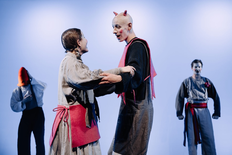 Вот как такое мрачное и странное играть? Взялся за это Арсений Мещереков, молодой, но уже очень активно и много ставящий режиссер. Сначала Мещереков учился в Московской школе нового кино у Артура Аристакисяна, кинорежиссера, который умеет видеть эстетическое в натурализме, исследуя боль и разрушение. Потом изучал театральную режиссуру с Андреем Могучим, заразившим своих студентов тягой к яркой визуальности, гротескности. Мещеряков уже нашел собственный набор приемов, использованный им и в других постановках: «утрированные образы, измененная речь, инфернальная пластика». Никаких отвлекающих декораций, лишь стены-экраны, их заливает то белым, то зеленым или красным цветом – эффектная работа художника по свету Евгения Киуру. Декоративные костюмы Анны Гориной явно отсылают к манере Боба Уилсона, чьи «Сказки Пушкина» идут на большой сцене театра. Отдельные детали: галстуки, шапки, пояса, картонные носы – укрупнены, гиперболизированы, выделены локальными яркими красками. Происходит визуализация постановочного решения, когда для каждого персонажа выбирается главный гротескный прием. Получается подобие кукольного представления, вроде ярмарочного «Петрушки», только очень печального.