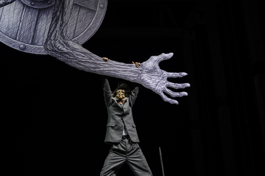 Илья Козырев в современном сером костюме в образе Режиссера начинает с того, что бьется головой в гигантский медный гонг, и это бесконечное движение сообщает нам и тщету его усилий, и отчаяние от нее, и непреклонную решимость продолжать. Весь остальной мир на сцене возникает из этого набата, созданного одним человеком, своим живым лбом бившемся о медный. В левый угол под висящий гонг встанет еще не раз и Иван Волков – то зачитывая газетные заметки, шельмующие формалистов, то клеймя серость и бездарность нового соцреалистического искусства. Последнее – это уже прямая речь Мейерхольда, с вызовом провозгласившего себя формалистом, раз уж антиформализм столь убог (что потом и привело его к «полной гибели всерьез»). Дон Кихот и Санчо Панса – здесь два разных, но близко мыслящих о театре творца, и воплощают они позицию одиночки против мира, против порядка, основанного на насилии. Против всей косной реальности.