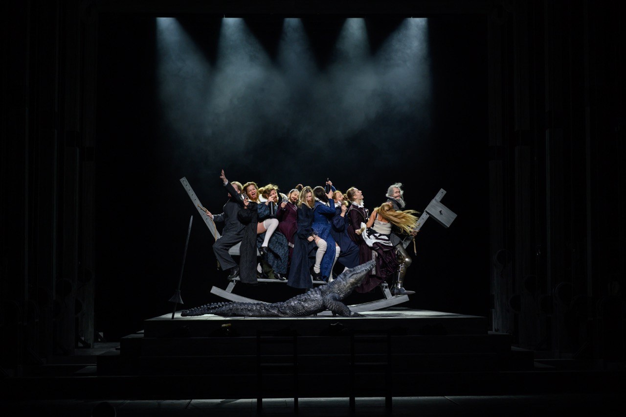 В спектакле заняты, кроме Козырева и Волкова, молодой артист Алексей Варущенко и восемь актрис разных поколений. Все играют по несколько ролей, легко перемещаясь из эпохи в эпоху и сохраняя многослойность существования: это труппа театра 1938 года, ведомая талантливым одиночкой, провозгласившим себя формалистом и репетирующим “Дон Кихота”. Актрисы меняют платья, сумочки, укладки и перчатки на «прозодежду», вызывающую в памяти парады физкультурниц; на рясы монахинь, на уборы свиты принцессы Долориды, на телогрейки зечек. Особенно хороши, на мой взгляд, Вера Харыбина – она играет такую театральную матрону, не памятник из прошлой эпохи, а живую память о старом театре, внимательно, с чутким интересом и толикой иронии относящуюся к исканиям молодого гения и с некоторой материнской нотой – к нему самому. Ирина Пегова, будто истосковавшаяся по большой работе, выдает весь темперамент, мастерство и умный юмор: от старательной актрисы советского театра, готовой мыть подмостки и твердить газетные передовицы о гражданском значении искусства, до заколдованной бородатой принцессы во главе такой же бородатой дамской свиты; от бритой бывалой зечки до гойевской ведьмы, хохочущей в полете на огромной деревянной лошадке-качалке – вместе с Дон Кихотом, насупленным Санчо и всеми фрейлинами. И Полина Романова с прозрачным тонким лицом и грустным взглядом, – сдержанно-деловитая, сосредоточенная молодая участница труппы формального театра, преображающаяся и в Дульсинею, какой воображает ее рыцарь, и во вполне земную Альдонсу, но сохраняющая нежное свечение в каждом образе.