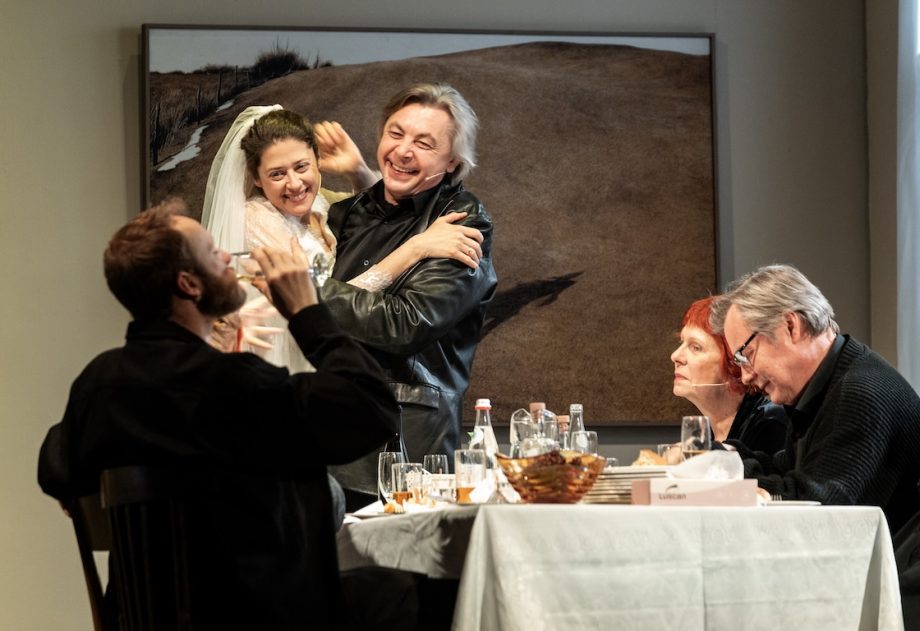 Всех их объединяют обстоятельства похорон и поминок — в последний путь провожают Верочку, жену Серебрякова, мать Сонечки, сестру Войницких, подругу, тетю… — близкого для всех человека. Для всех, кроме Елены Андреевны, которая довольно скоро оставляет всю явленную в начале застенчивость. Героиня Одинцовой, скромно и виновато щебечущая в процессе поминальной беседы, внезапно оголяется до нижнего белья, ловко переодевается в свадебное платье и вот уже они с Серебряковым в качестве молодоженов медленно кружатся, милуясь в объятьях. Играет ненавязчивая музыка. Венчает сцену крупный план лиц Маши и Вани Войницких, трансляция которого занимает половину зеркала сцены. Недоумевающий, но пытающийся скрыть недоумение герой Гордина, и отпустившая все старания спрятать реальные эмоции Верберг — с осунувшимся от разочарования лицом и слегка вздрагивающими бровями и веками. Артисты МТЮЗа хорошо знают правила игры Петра Шерешевского: любая сцена — твоя, в том смысле, что может оказаться на крупном плане, где все реакции — в фокусе. Не без помощи режиссера они показывают высший класс слаженной ансамблевой игры, и наблюдать за этим — отдельное наслаждение.